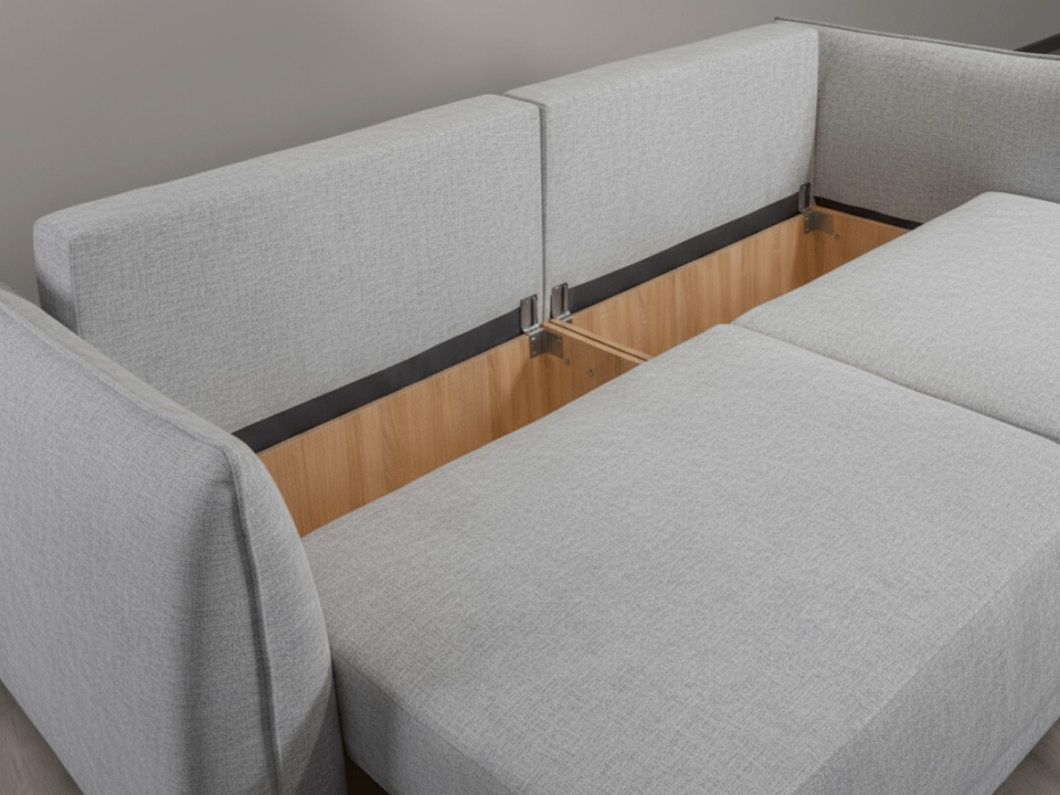 «Тик-Так» – принцип работы прост: по первому щелчку («тик») диван раскладывается, по второму («так») – возвращается в исходное вертикальное положение. Сначала сиденье поднимается, затем перемещается вперед и, наконец, плавно опускается. В образовавшуюся нишу, которая также является ящиком для белья, укладывается спинка дивана.