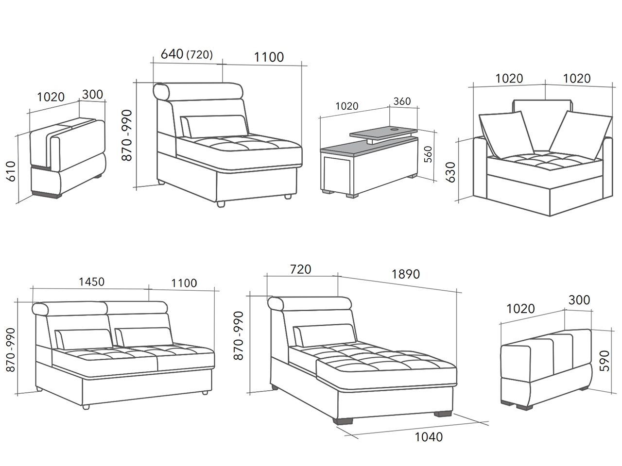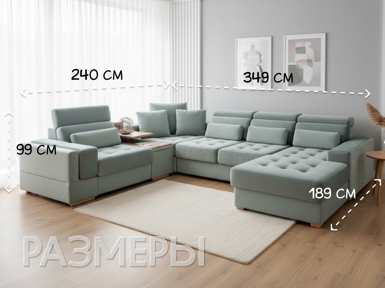 • Угловой модуль комплектуется 2 подушками размером 50x50 см и одной подушкой размером 5x55 см с валиками.