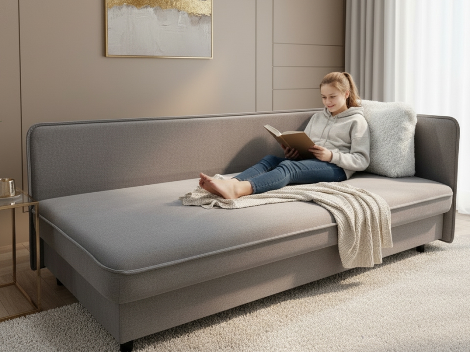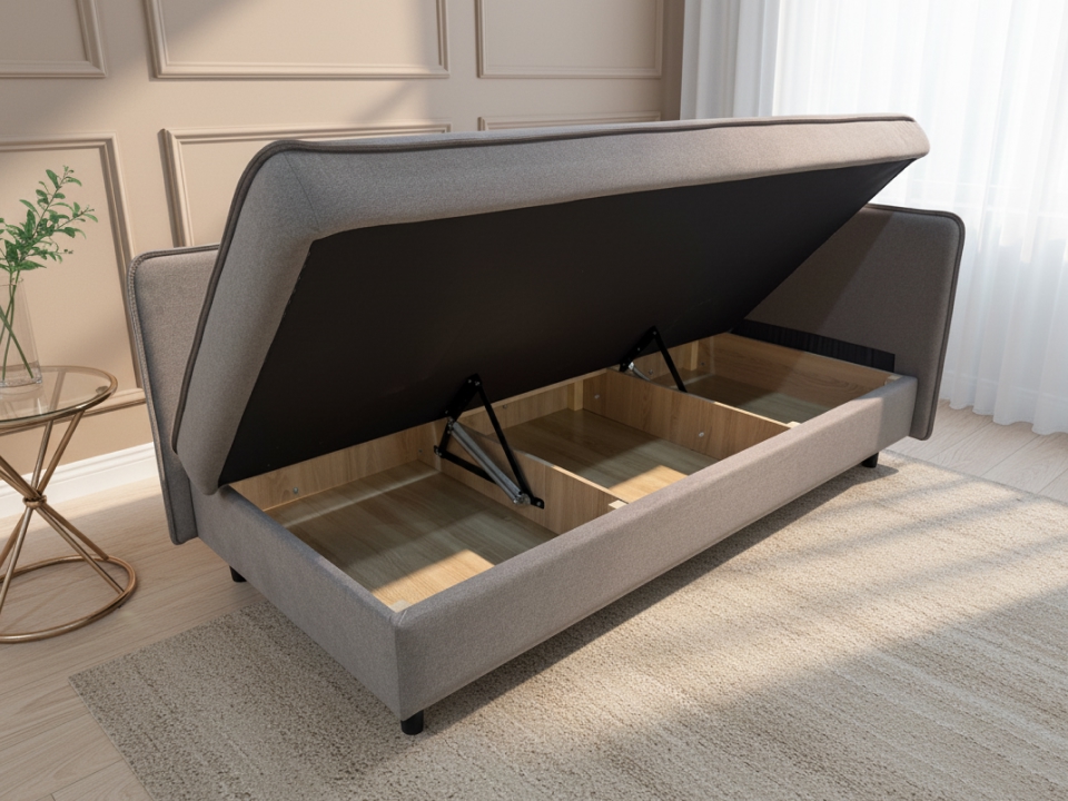 Подъемный механизм – в конструкцию вмонтирован механизм, способный поднимать спальное место, открывая вместительный отсек для хранения постельного белья и принадлежностей. Преимущества: вместительный отсек хранения, компактные размеры, доступность в эксплуатации и уходе.